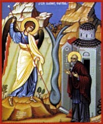 aaaDe toute éternité Dieu est Lumière: la seule véritable Lumière éternelle, immatérielle, infinie et absolument incompréhensible. Il repose dans le secret inaccessible de Sa Nature unique et jouit de la communion inexprimable d'amour entre Ses trois Personnes: le Père, le Fils et le Saint Esprit. Il est bon et principe de toute bonté et de tout amour; c'est pourquoi Il ne S'est pas contenté de Sa propre contemplation, mais dans la surabondance de Sa bonté Il a voulu qu'un autre participât à Sa lumière et Il a tiré le monde du non-être à l'existence. Avant de créer le monde visible, Il a amené à l'existence par Son Verbe et perfectionné en sainteté par Son Saint-Esprit la nature angélique, faisant des Puissances célestes et incorporelles ses Serviteurs zélés et ardents comme un feu immatériel. Ils sont des lumières secondes, qui reçoivent par la Grâce du Saint-Esprit les illuminations de la Lumière première et sans principe, et la participation à Son immortalité. Fidèles images de l'Essence Divine, les Saints Anges sont de nature spirituelle, dépourvus de la lourdeur du corps, toujours en mouvement, libres et raisonnables. Ils voient Dieu dans la mesure où ils peuvent l'atteindre et trouvent dans sa contemplation leur nourriture, leur stabilité et la raison même de leur existence. Bien qu'ils soient libres de toutes affections du corps, ils ne sont pourtant pas impassibles comme Dieu, car ils ont été créés par un changement (le passage du non-être à l'être). Ainsi sont-ils difficilement portés au mal, mais non à l'abri de son atteinte. C'est pourquoi ils doivent faire usage de la souveraine liberté que Dieu leur a accordée pour persévérer dans le bien et progresser dans la comtemplation des Mystères Divins, sous peine d'être entraînés irrémédiablement vers le mal et l'éloignement de Dieu, et sans pouvoir alors compter, comme l'être humain, sur le repentir, car ils sont dépourvus de corps.